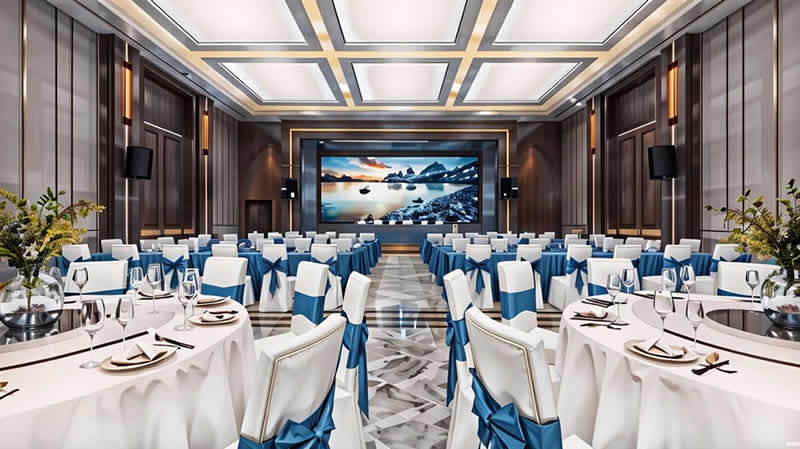小宴會廳(≤300㎡):面積通常在 100-300㎡,高度 3-4m。建議屏幕面積控制在15-25㎡,例如常見的 3m×5m 或 3m×6m,避免屏幕過大造成壓迫感。