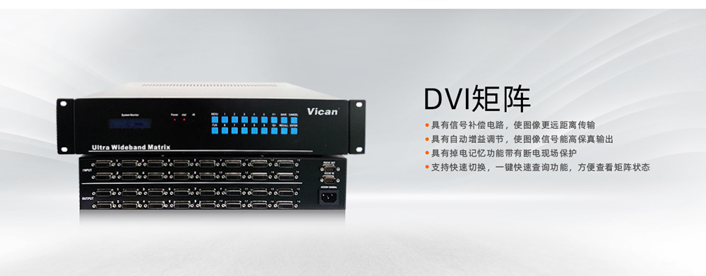 DVI矩陣JZ1000系列是專(zhuān)用于DVI高清2K信號(hào)輸入與輸出的控制設(shè)備,其特點(diǎn)與HDMI信號(hào)相同,都是高清信號(hào)控制系統(tǒng),包含4進(jìn)4出、4進(jìn)8出、4進(jìn)16出、8進(jìn)8出、8進(jìn)16出等;